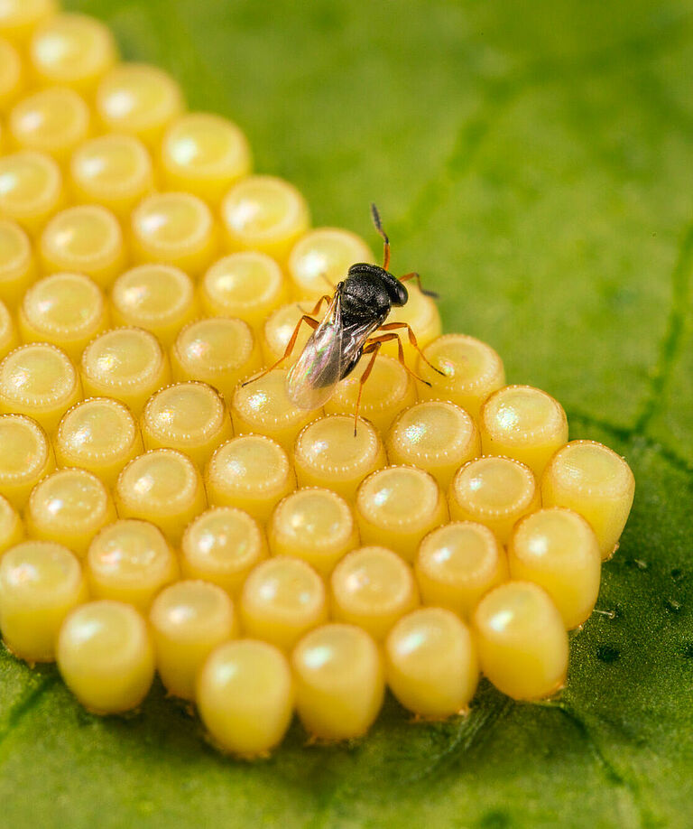 Caterpillars can devastate crops by feeding on leaves and fruits. Certain parasitic wasps, like Trichogramma species, lay their eggs in caterpillar eggs, preventing their development.