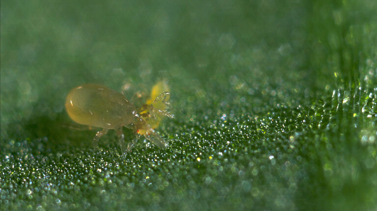 The life cycle of Neoseiulus cucumeris consists of the following stages: egg, larva, protonymph, deutonymph and adult. Eggs are laid on the underside of leaves on leaf hairs or in the axils of main and side veins. They are oval, white and have a diameter of approximately 0.14 mm. The larvae have six legs, are the same colour as the eggs, and are only slightly larger. They do not need to feed to develop into a protonymph. The nymphs are larger than the larvae, have eight legs and are pale brown. Adult mites have eight legs, are light beige and have a flat, elongated body. They are roughly 0.4 mm in length. Males are smaller than females. Protonymphs, deutonymphs and adults are very mobile and actively search for food on the underside of leaves. Due to their size and colour they are difficult to spot in the crop.