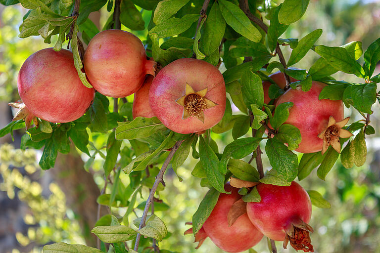 The pomegranate (Punica granatum) is a small tree or deciduous shrub that belongs to the family of Lythraceae. The plant can grow up to between 5 and 8 metres (16 and 26 feet) tall. The pomegranate was originally cultivated near modern-day Iran and spread to the Mediterranean region and northern India.