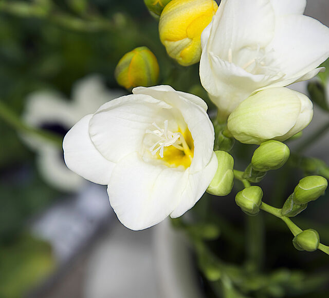 Freesia belongs the herbaceous perennial flowering family, Iridaceae. Species of the former genus, Anomatheca, are now included in Freesia. It originates in southern Africa, from Kenya south to South Africa. These ornamental funnel-shaped plants are cultivated hybrids of a number of Freesia species.