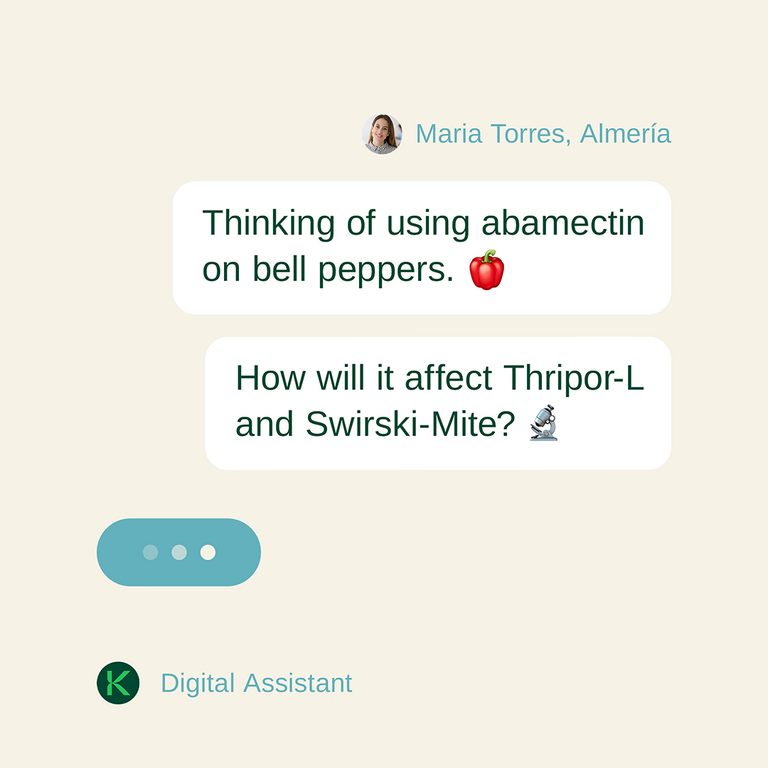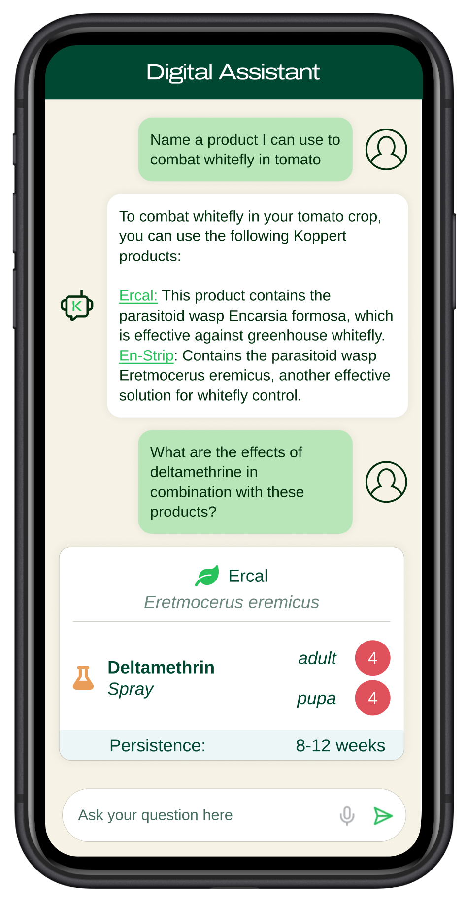 Koppert One Side Effects offers two convenient ways to access information: use the app's standard search feature or consult the Digital Assistant for advice. Simply ask any questions related to side effects and receive prompt, accurate answers to support informed decision-making. This advanced capability, combined with an user-friendly design, provides flexibility and allows you to choose your preferred method for retrieving information.