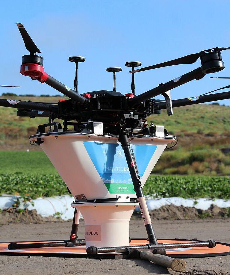 Natutec Drone combines more than 50 years’ experience in the production of biologicals, with extensive R&D knowledge and experience in the field, to produce a high-tech dispersal mechanism that transports vulnerable beneficial organisms to disperse them accurately where they are needed. The complete system (drone and dispersal system) weighs 15 kg/33 lbs and it has a wingspan of 1.5 meters/4.9 feet. The Natutec Drone can carry loads of up to 13 litres.