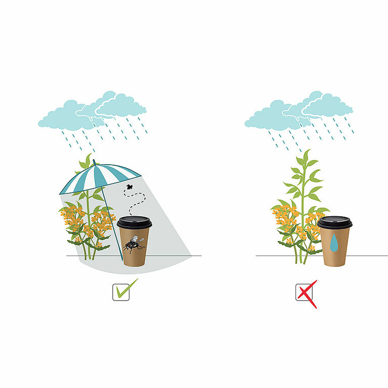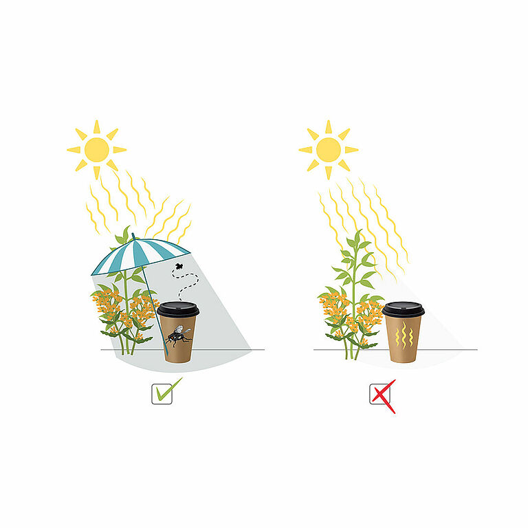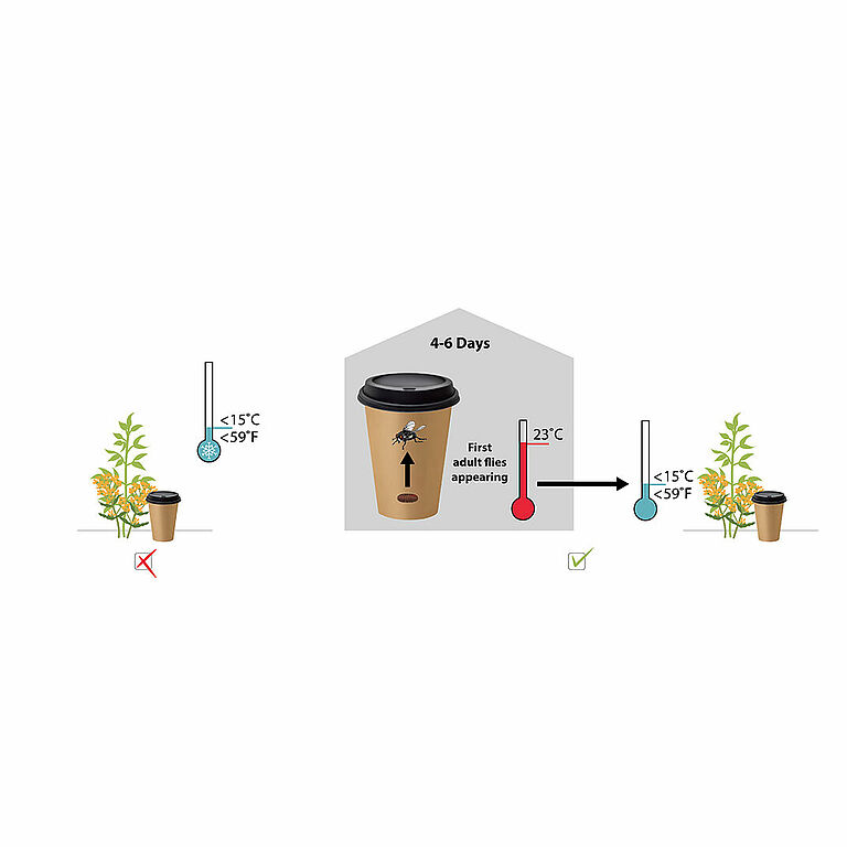 Protect the opening for the flies against heat. It is preferable to use white of light coloured bags/cups at temperatures above 20 °C.