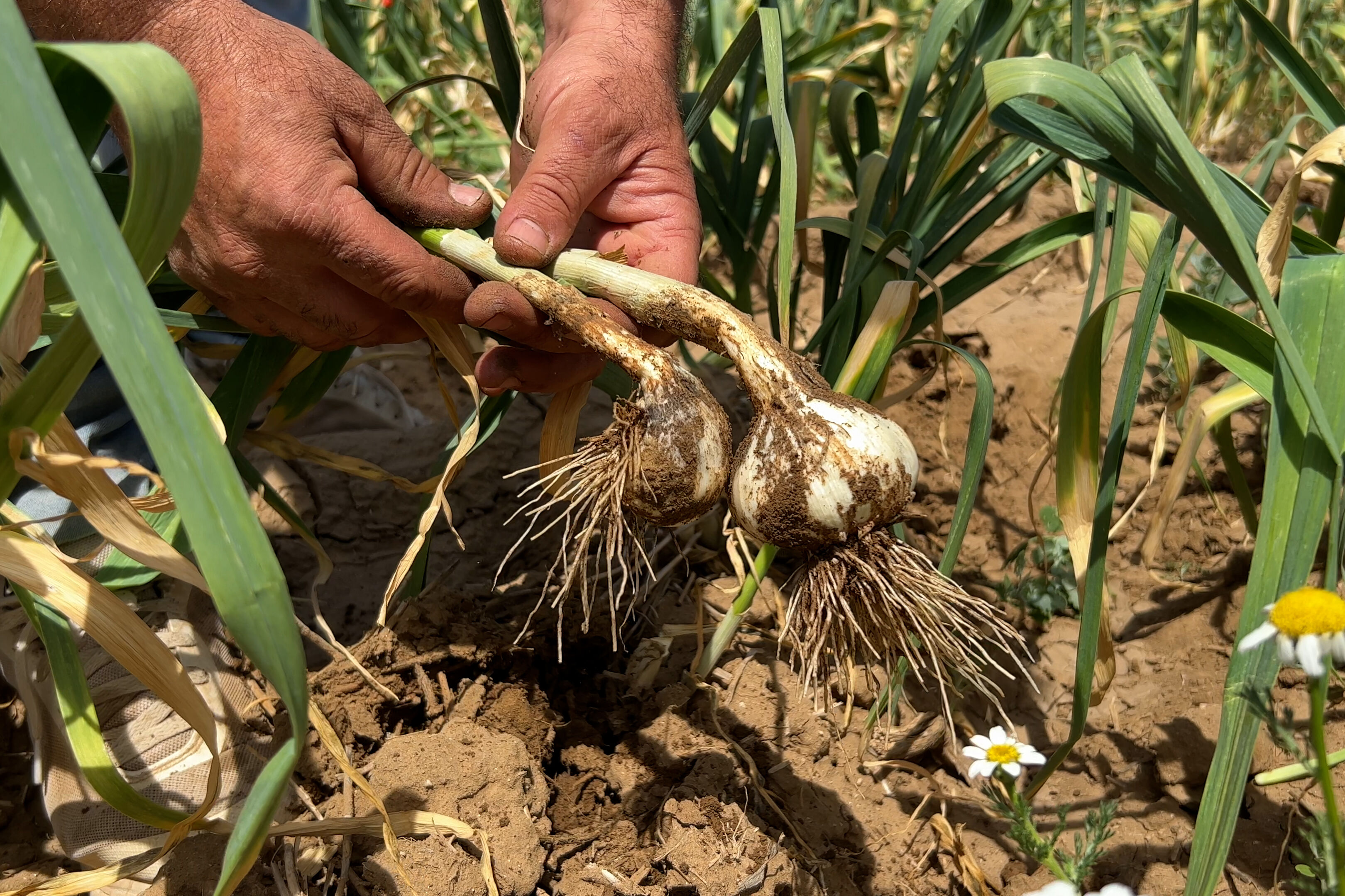 When the young garlic plant is already visible, a second application of Trianum is recommended. Then, when the plant has a minimum height of 10 centimeters, applications of Vidi Parva and Veni Biosulfur are recommended as a protective measure against aerial fungi, such as Septoria tritici and Puccinia allii.