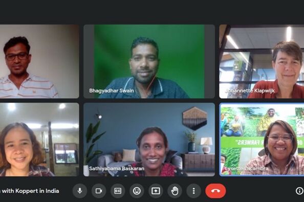 Mahesh Kumar (Technical Manager, Koppert India), Bhagyadhar Swain (Technical Specialist, EWS-KT India), Johannette Klapwijk (General Manager, Koppert Foundation; Knowledge Manager, Koppert), Piyawan Phuphong (Technical Research Lead, EWS-KT), Sathiyabama Baskaran (Head, EWS-KT India), and Lysette Lacambra (Technical Support Hub Manager, EWS-KT) meet to collaborate on action research