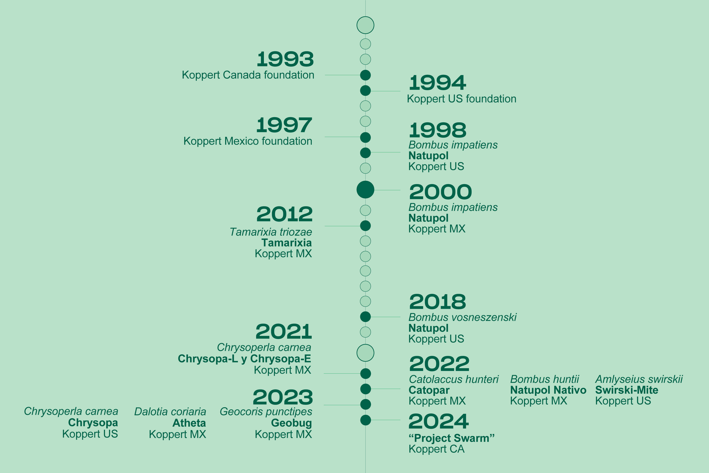 Koppert is active in more than 100 countries worldwide, operating in 34 countries through its subsidiaries and reaching others via an extensive network of distributors. We offer nearly 120 natural solutions, along with a wide range of complementary crop protection products. In North America, producers will benefit from an expansion plan at Koppert's operational centers—an ambitious initiative aimed at ensuring a precise and reliable supply of natural enemies and pollinators.