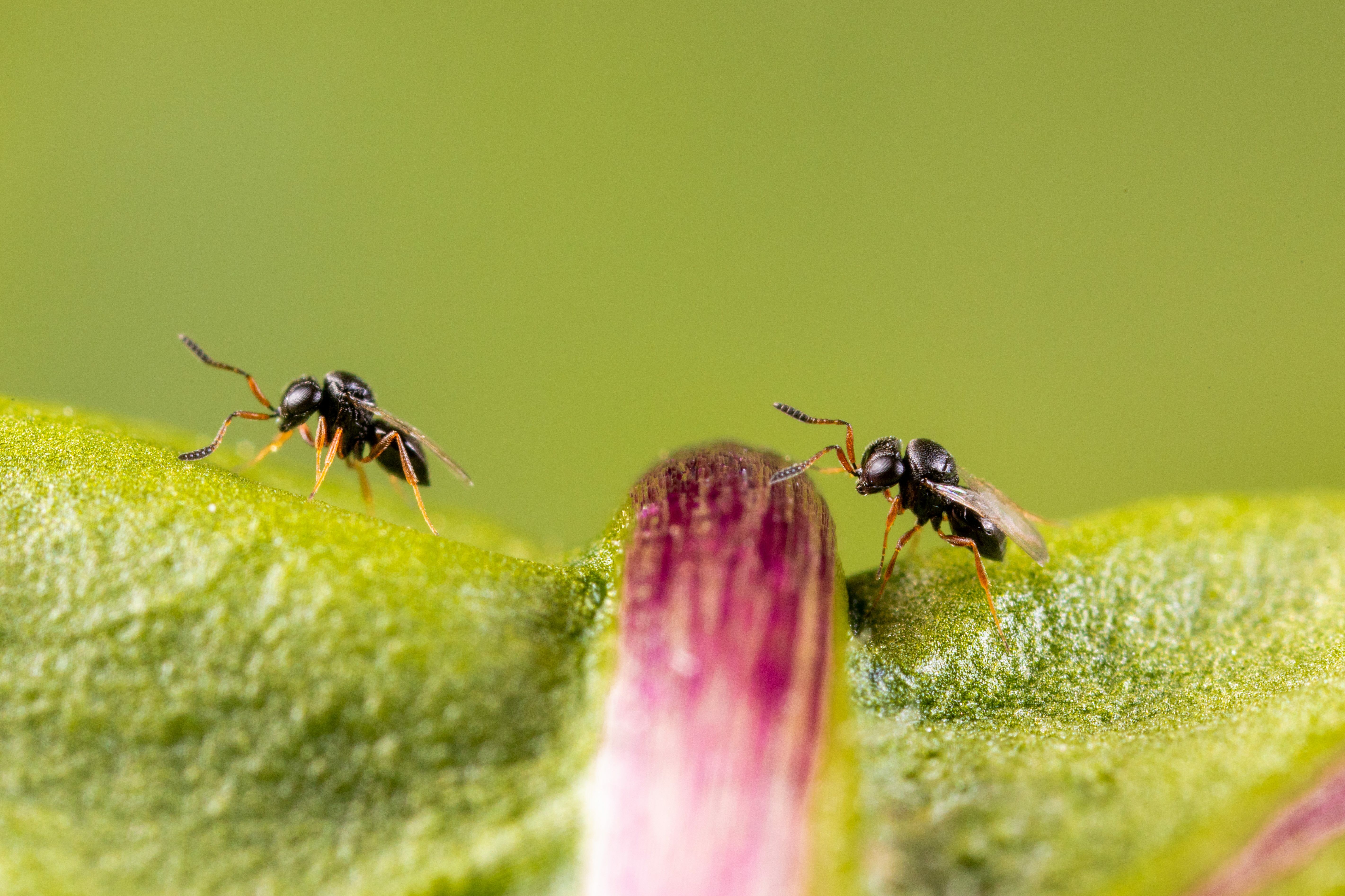 The Trissolcus basalis parasitic wasp is the most important natural enemy of the stink bug. Fertilized female wasps lay their eggs inside those of the stink bug – the larvae of the wasp then develop inside those eggs. Once they have pupated, they bite a hole in the Nezara egg, putting a stop to further population growth.