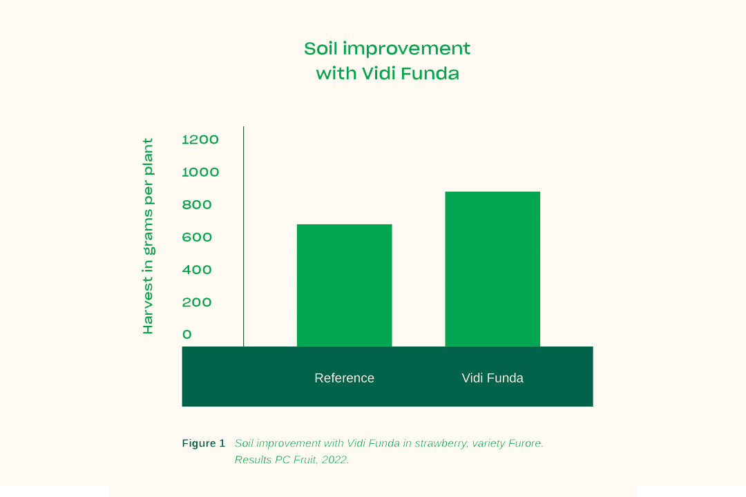 ‘Besides a significant increase in crop yield of up to 25,6% in conclusive trials, we have observed a rewarding increase in the shelf life of strawberries when using Vidi Funda as a soil improver in another trial. We are now looking at the potential benefits of this soil improver for other crops. It is already also being used successfully in chrysanthemums, flower bulbs and pot plants,’ Roozemond concludes.
