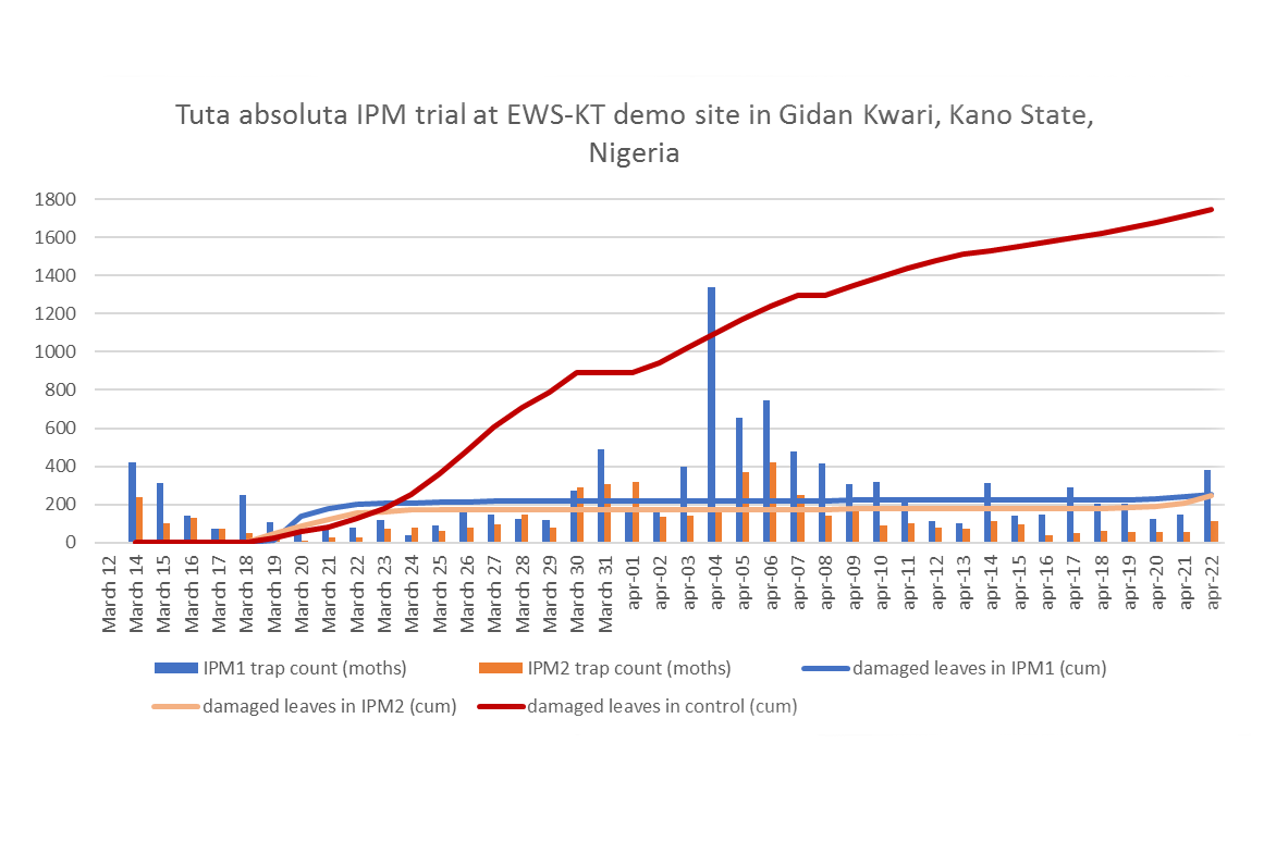 Counts on the number of moths trapped and number of damaged tomato leaves in the IPM treatments versus chemical control clearly show the effectiveness of IPM treatments.