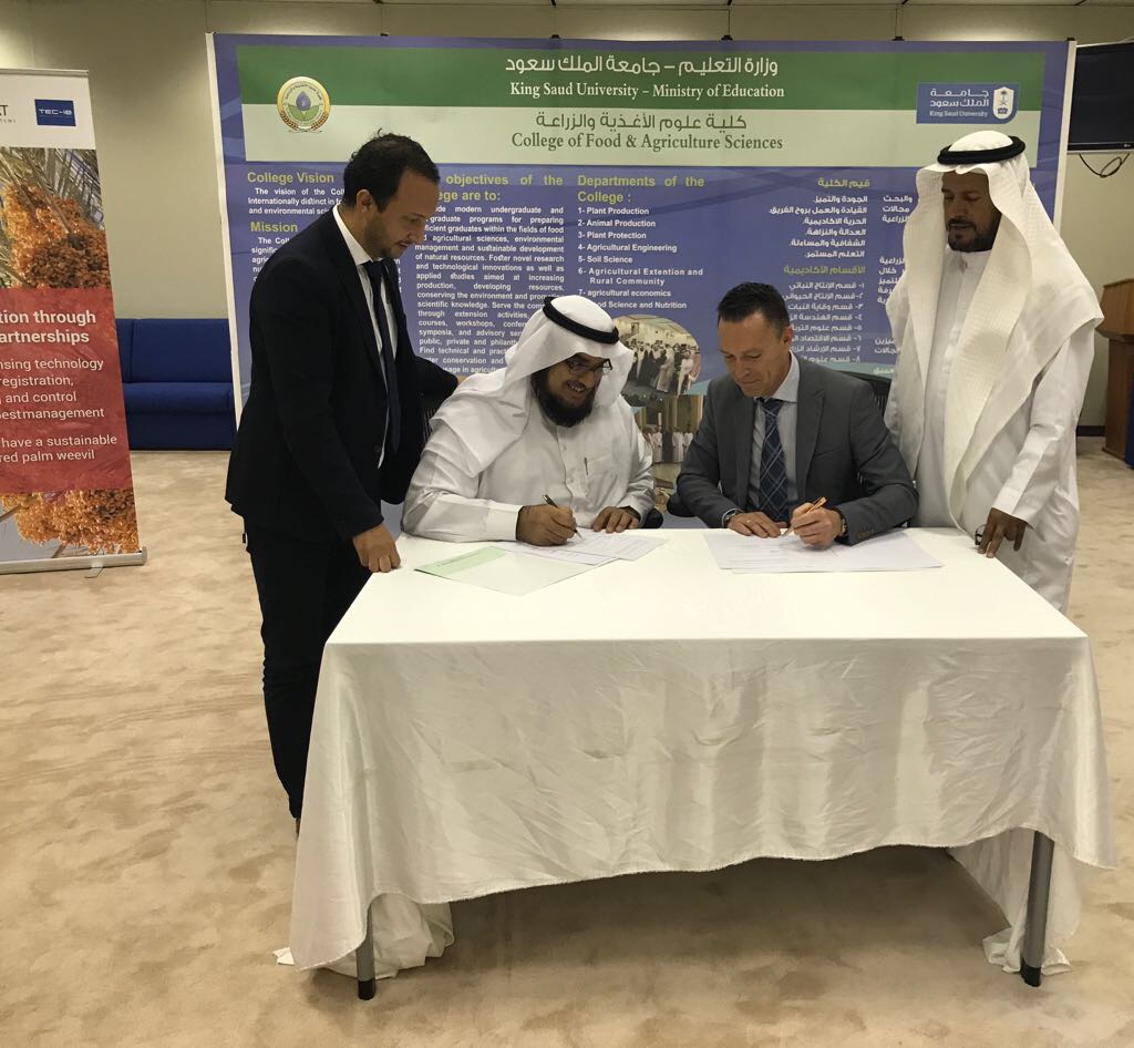 The contract was signed by Koppert’s Product Manager Rick van der Pas, and DEAN professor Nasser Al-Suhaibani of the King Saud University. It was also signed by Prof. Abdulrahman Saad Aldawood, the head of Economics Entomology Research Unit (EERU) at the Department of Plant Protection, College of Food and Agriculture Sciences, Riyadh, Saudi Arabia. The EERU team will be responsible for doing the research and development work in labs and field trials.