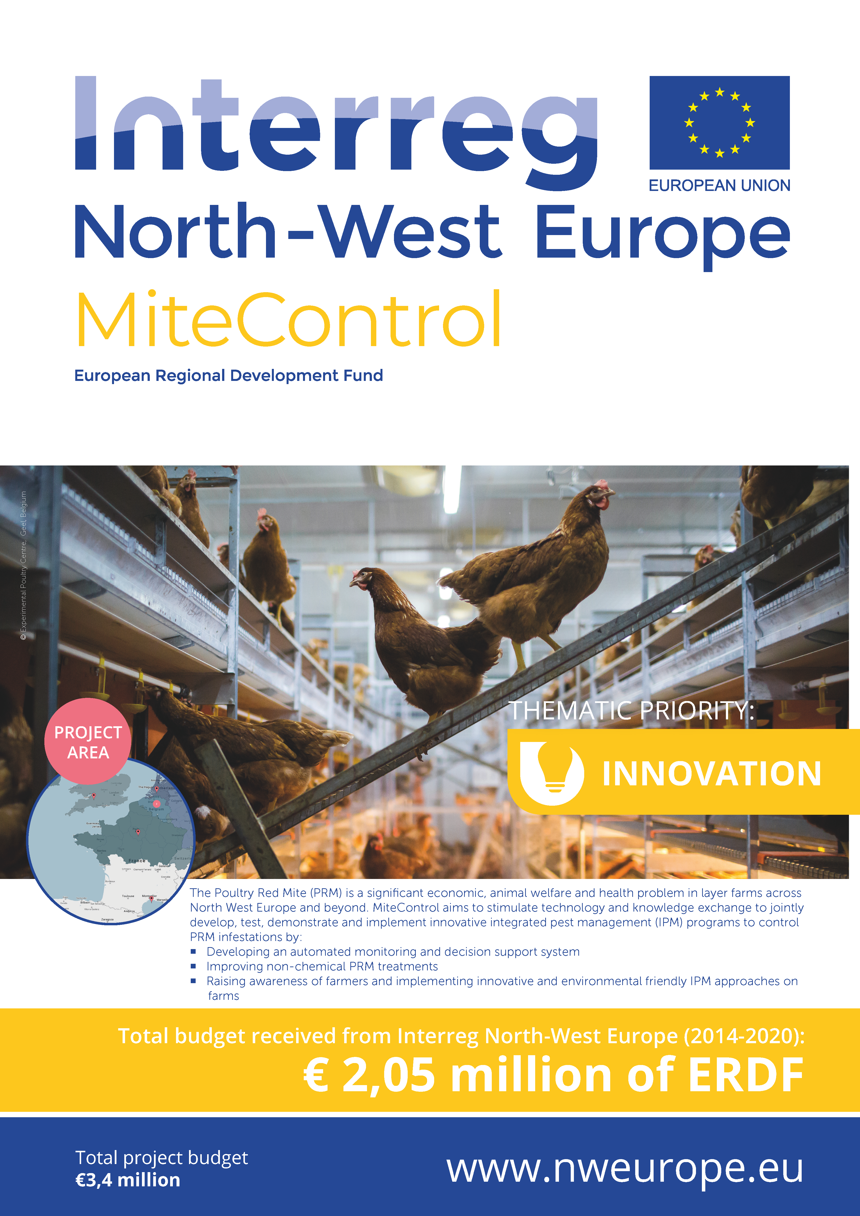 MiteControl is a collaboration of 7 partners: Experimental Poultry Centre in Geel (Belgium), Belgbroed (Belgium), Université Paul-Valéry Montpellier (France), Institut Technique de l’Aviculture in Paris (France), KU Leuven (Belgium), RSK ADAS Ltd in Bristol (UK) and Koppert Biological Systems. Koppert Biological Systems will provide natural enemies and expertise in this project.