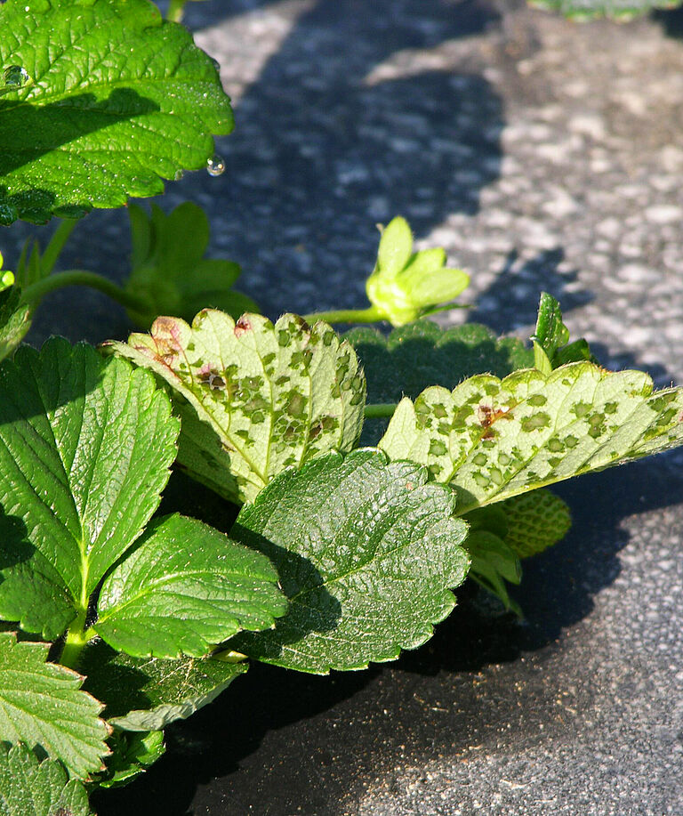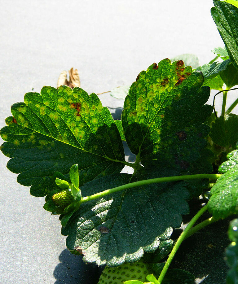 Xanthomonas fragariae initially causes small, water-soaked lesions on the underside of the leaf. They enlarge to angular spots, often limited by the small veins. The distinctive feature is the way the lesions look when using different light sources: when reflected light is used, the lesions look dark green, but when transmitted light is used, they are translucent. When conditions are humid, a viscous bacterial exudate forms on the underside of the leaf. This exudate changes to a white film when it dries. Lesions may merge as they grow and later also become visible on the upper side of the leaf as irregular spots which are first reddish brown and then become necrotic. The foliar symptoms are the most important, but also all types of vascular tissue of the crown can be infected, creating a look similar to that of a Phytophthora fragariae infection.