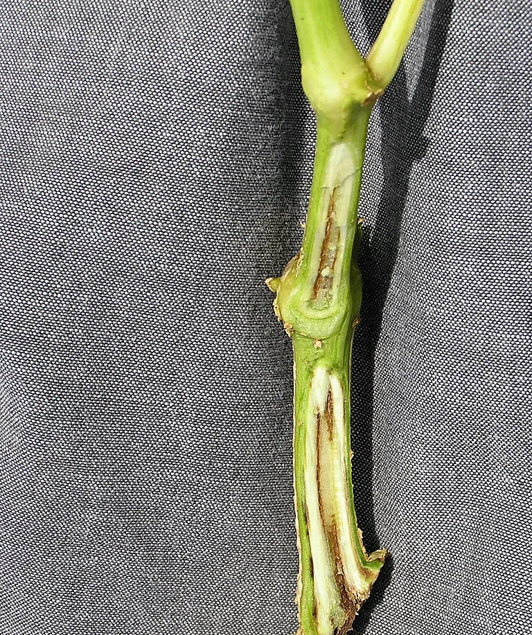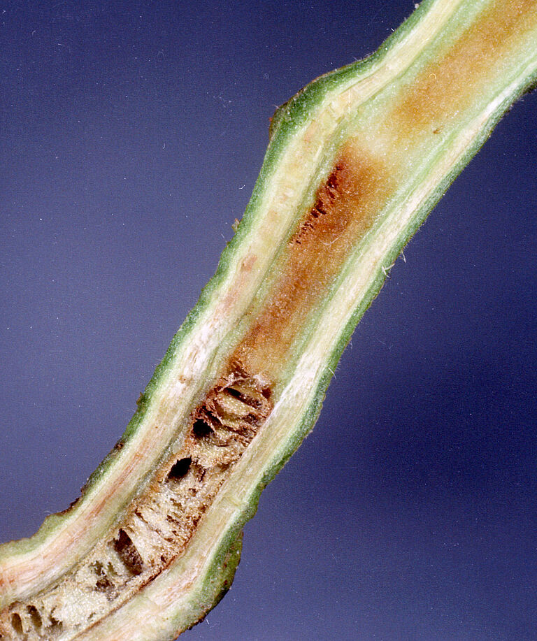 In tomato, the youngest leaves are affected first. They show signs of wilting during the day which may disappear in the early stages of infection. Under conditions favourable for the bacteria, the whole plant will wilt soon after the first symptoms appear. When conditions are less conducive for disease development, the plants may show signs of stunting and produce many adventitious roots on the stem. The vascular stem tissue is coloured brown and when the stem is cut, bacterial slime oozes from the wound. This is the way to distinguish it from Verticillium or Fusarium wilts.
