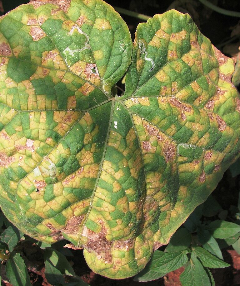 Downy mildew pathogens infect mostly the leaves but occasionally also stems and fruits. They cause lesions on the upper leaf surface, bordered by the veins, which are first yellow and then turn brown. On the underside of the leave fluffy growth appears which is first white and later turns grey-brown. This is actually the sporulation of the pathogens extruding from the stomata.