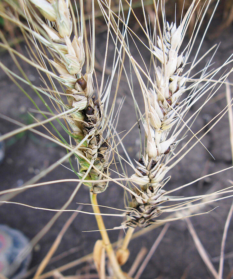 Additionally, plants only reach a fraction of their normal height. Spikes are generally broader and the glumes opened wider, than in plants infected with Tilletia tritici and Tilletia laevis