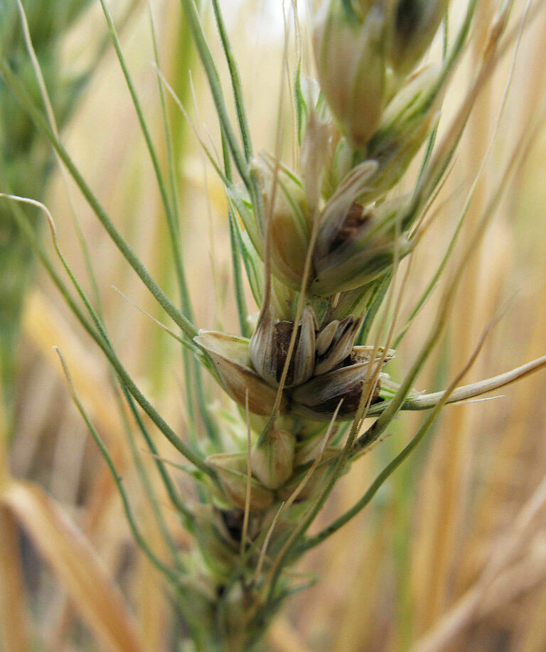 Tilletia controversa causes (bunted) heads that are slender and remain green longer than healthy heads. The glumes are opened either on some or on all spikelets, showing the bunt (smut spore) they contain, which is larger than a normal kernel. The bunt balls are grey-brown. They rupture at harvest and release black, powdery spores, that smell like fish, hence the common name stinking bunt.