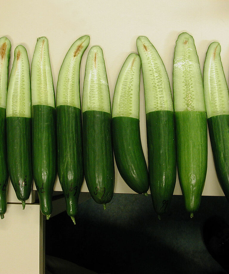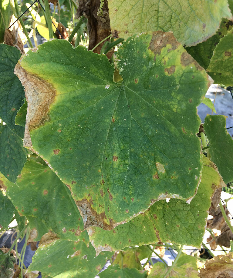 Mycosphaerella cucumis in cucumber causes brown lesions on the foot and higher up on the stem. On the lesions, golden-brown gummy drops occur, hence the name gummy stem blight. On the lesions, black specks, the new fruiting bodies with spores, become visible. On the leaves, round and extending lesions may occur. In cucumber, the most important symptom is internal fruit rot, which can only be recognized from the outside by the small narrowing of the tip of the mature fruits. The symptoms on stems, leaves and inside the fruits may occur together or individually.