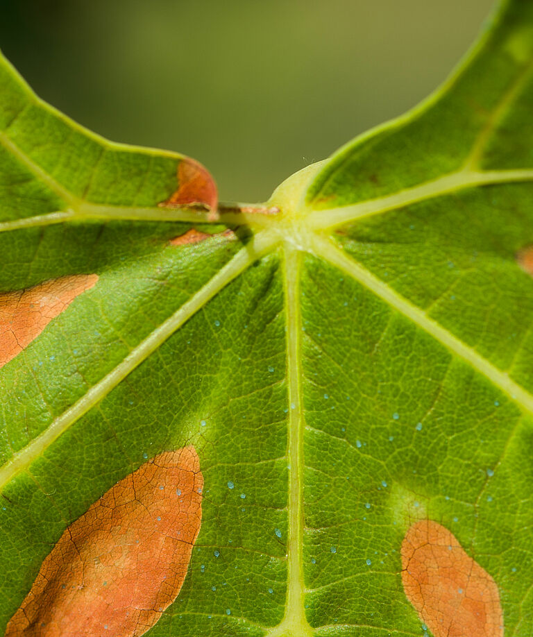 Symptoms are variable interveinal chlorosis of the leaves, resembling zinc deficiency. Infection becomes systemic more rapidly in young trees than in older trees. In the latter, it may stay limited to certain branches. When the leaves mature, slightly raised gummy lesions occur on the underside of the leaves. These lesions start out in a light-brown colour, turning to dark-brown or necrosis. Fruits of infected trees are much smaller and their sugar content is higher. The early blossoming and fruit set in peach does not occur in citrus, there is no difference between infected and healthy trees. Normal fruit abortion does not happen so total production remains similar, with more smaller fruits in infected trees. The infected trees grow slower than normal and look stunted. Twigs and branches die and the foliage becomes thinner, but the trees don’t die of the disease.
