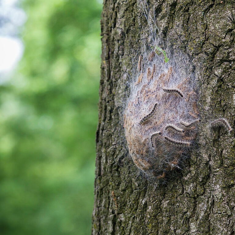 The nests of caterpillars on infested trees are clearly visible. The larvae of the oak processionary moth cause severe defoliation, reducing the viability of oak trees. However, this is usually less of a problem as the trees normally recover from this.