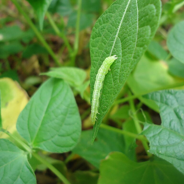 The eggs are round and measure about 0.5 mm. They are initially light cream in colour, turning light brown as they come close to hatching. The females lay around 600 eggs. Eggs are deposited singly, mainly on the undersides of the leaves. The embryo takes around 2.5 days to develop. The newly-hatched caterpillars are light green, with longitudinal white stripes and black dots. They reach 40 to 45 mm in length in their final larval stage. With each instar, the caterpillar undergoes a noticeable change in colour, from light brownish-green, to translucid lime green. The Soybean looper has six instars, and characteristic internal processes in the mandible that distinguish it from the cabbage looper Trichoplusia ni. The total consumption of soya bean leaves by the caterpillars is between 64 cm2 and 200 cm2. After the final larval instar, the caterpillar is transformed into a pupa, which takes place inside a cocoon (silk threads), usually on the underside of the leaves. The pupa is pale yellow to pale green in colour at the start of its development, with irregular dorsal pigmentation up to 48 hours before it emerges. The pupal period is completed in seven to nine days, until the emergence of the adults. As the days pass, the pupa become darker. The standard colouration, however, depends on the type of diet to which the caterpillar is exposed. In general, caterpillars of C. includens that feed on leaves will create dark green pupae. Mating occurs at night. The dry period is favourable for its development. The adults are greyish-brown, with two silver markings on the first pair of wings. When at rest, the wings of the moth form an angle of approximately 90 degrees. It has a wingspan of approximately 28 mm. The base of the wing is lighter. The lifespan of the adult moth is around 15 days. Mating usually occurs between at night. The sex pheromone is very important for the females in this process. The biological cycle is around 25 days.