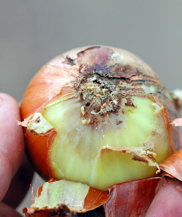 The eggs are laid by the female onion fly on the young leaves, necks of onion seedlings or in the soil close to the base of onion plants. The onion fly larvae that emerge from the eggs tunnel into the onion bulbs, harming the roots and foliage. This leads to retarded growth, decreased yield, or even death of the plant.