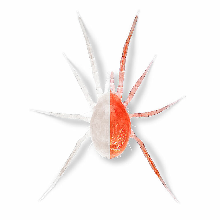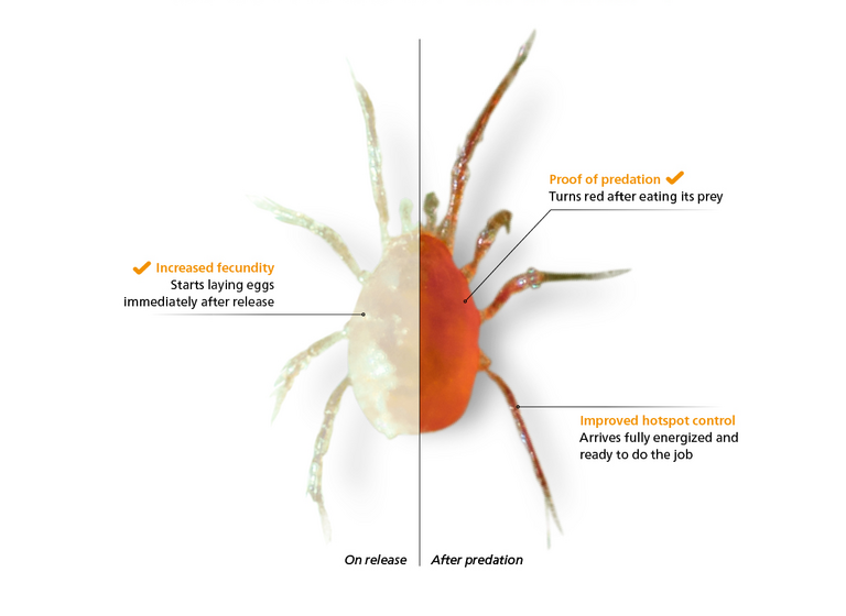 The Phytoseiulus persimilis turns red after eating their prey. Once the predatory mite has consumed several spider mites, the color will gradually change to the characteristic red-orange color. This takes 1-2 days. After introduction of “white” Spidex Vital it therefore is a clear proof of predation when red Spidex Vital is observed.